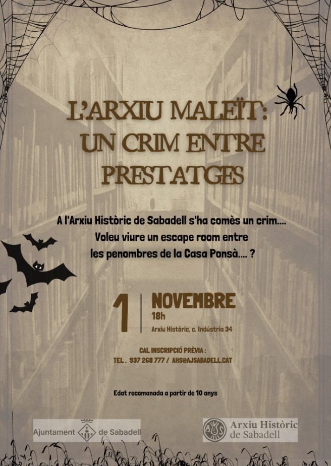 A l'Arxiu Històric de Sabadell s'ha comès un crim. Voleu viure un escape room per les penombres de la Casa Ponsà? Activitat recomanada a partir de 10 anys.