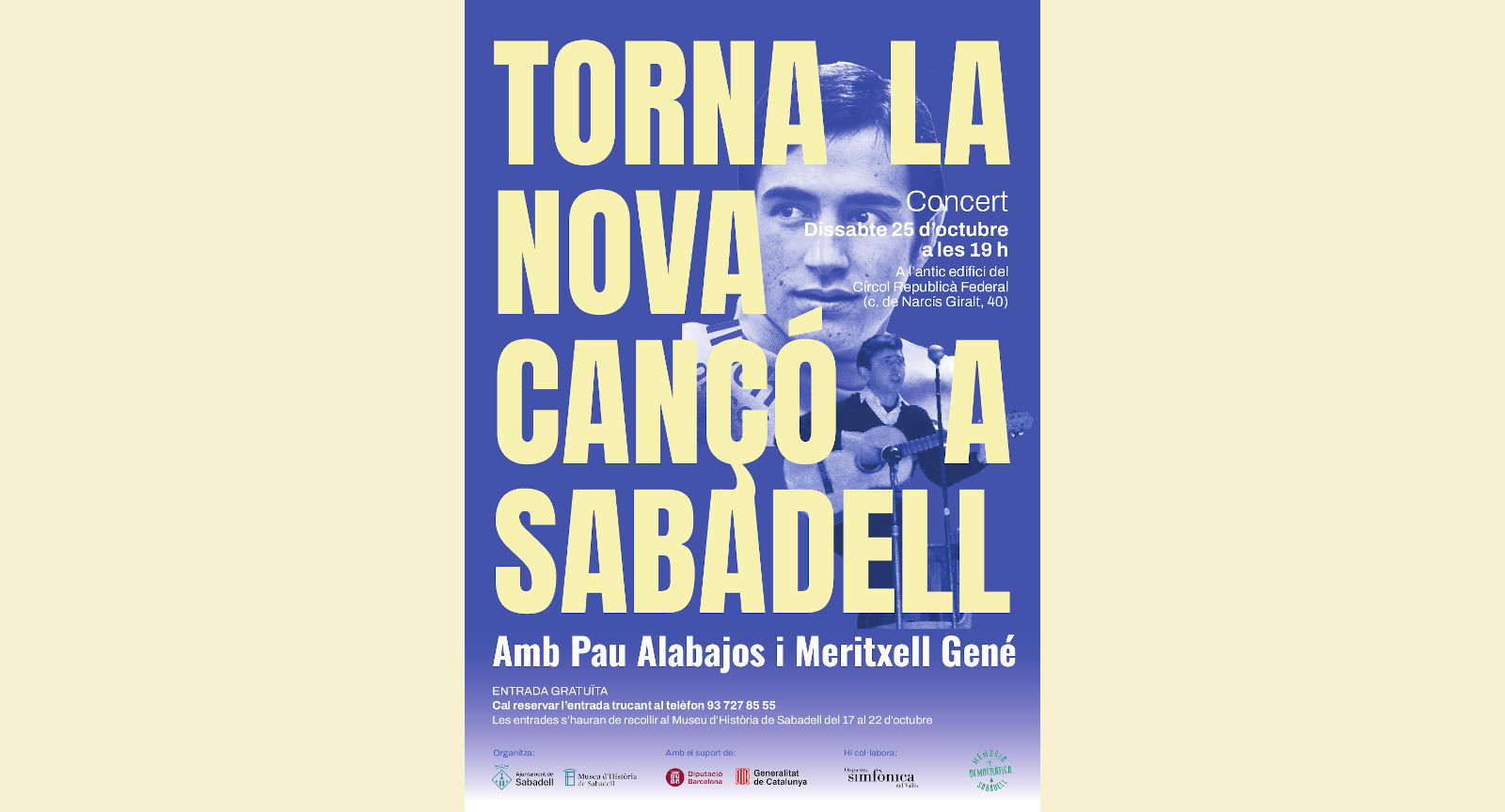 Concert Torna la Nova Cançó a Sabadell. A càrrec de Pau Alabajos i Meritxell Gené. A l'antic Círcol Republicà Federal.