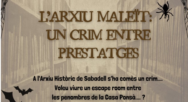 Dissabte 1 de novembre de 2025, de 18 a 19.30 hA l'Arxiu Històric de Sabadell s'ha comès un crim. Voleu viure un escape room per les penombres de la Casa Ponsà? Activitat recomanada a partir de 10 anys.