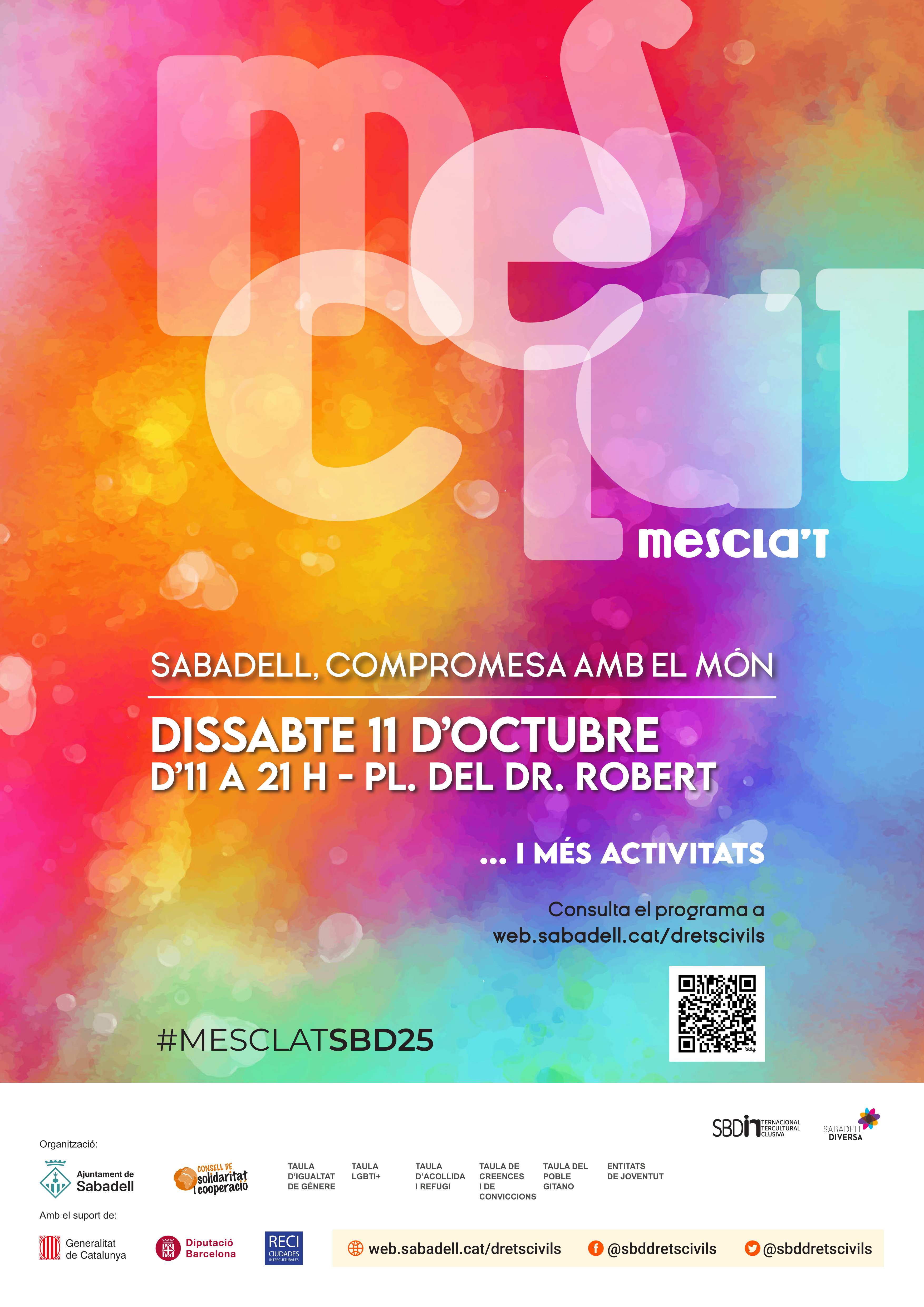 Fira d'entitats : Gimcana Mescla't. Voltes del Mescla't. Espai de joc, circ i experimentació sensorial. Jocs de comerç just. Contes per capgirar el món. Racó gastronòmic. Taller d'estampació de bosses de roba. Contes sobre drets humans.